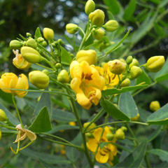 伞房决明常绿灌木,高2-3米,多分枝,枝条平滑,叶长椭圆状披针形,叶色浓绿,由3~5对小叶组成复叶。圆锥花序,伞房状,鲜黄色,花瓣阔,3-5朵腋生或顶生,花期7月中下旬至10月。先期开放的花朵,先长成纤长的豆荚。荚果圆柱形,长5—8厘米。花实并茂,果实直挂到次年春季。